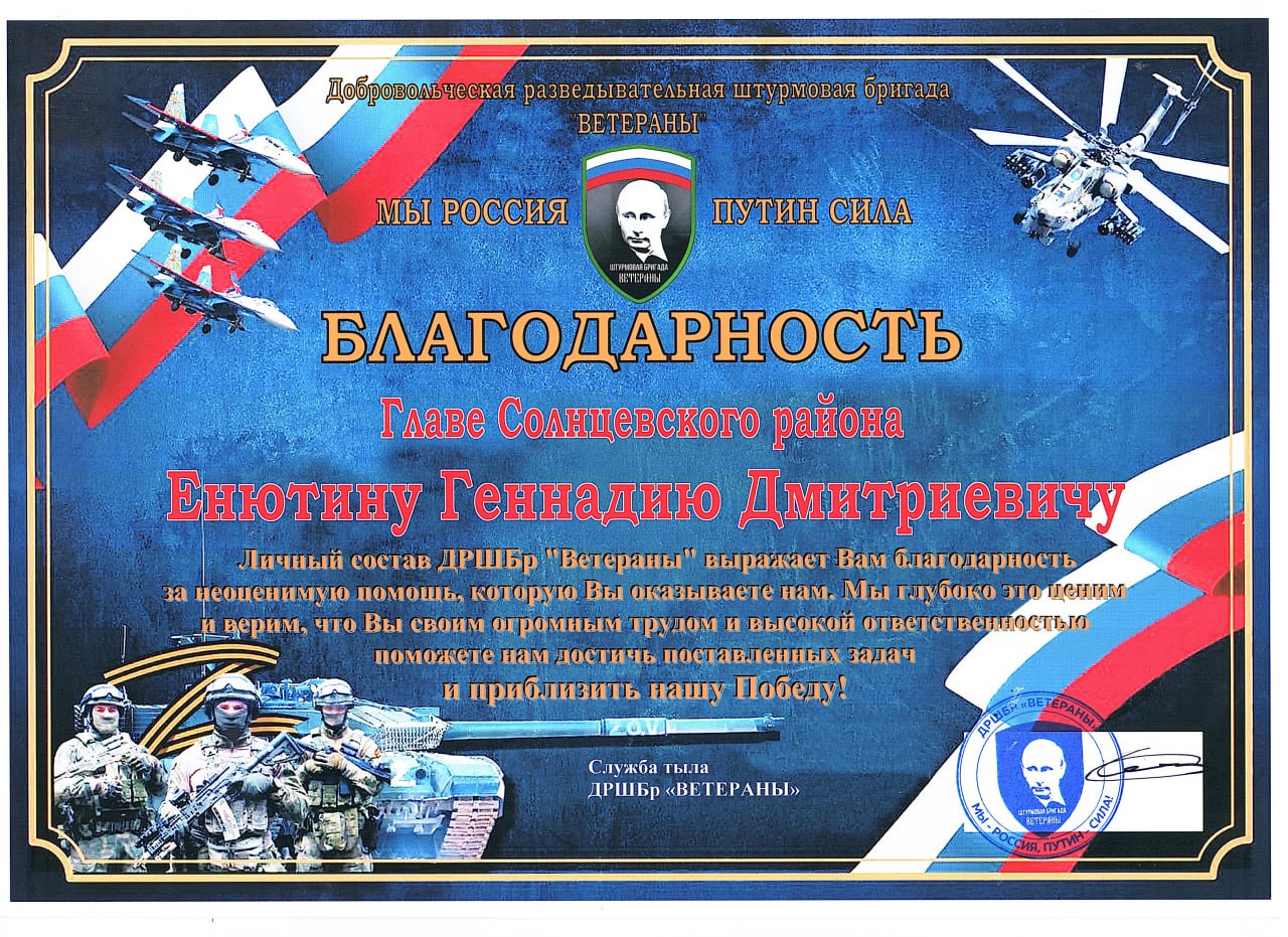 Продолжаем получать слова благодарности от наших воинов, которым Солнцевский район оказывает гуманитарную помощь. Сегодня пришла Благодарность от Добровольческой разведывательной штурмовой бригады "Ветераны".