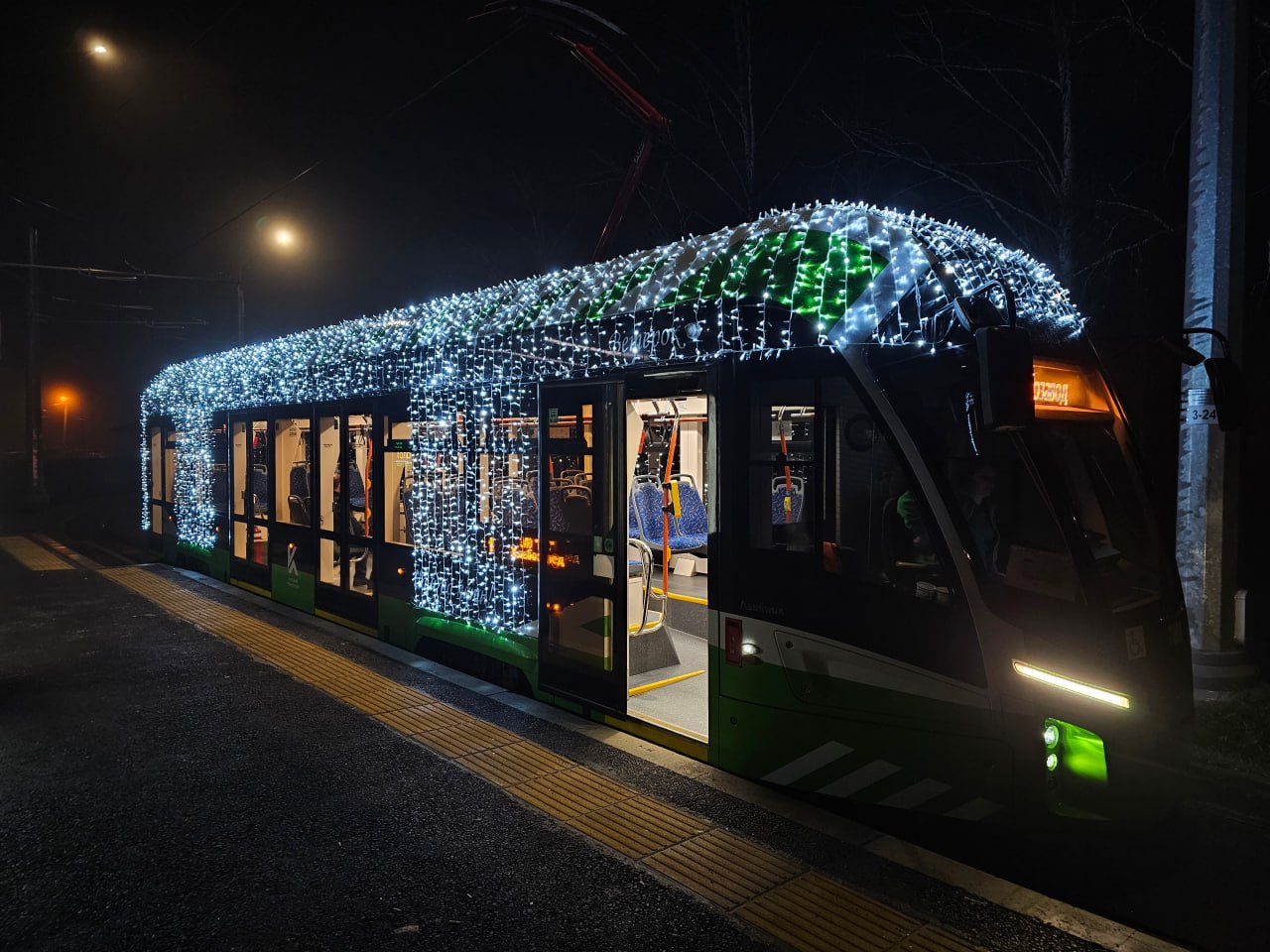 С сегодняшнего дня «Ветерок» следует по маршруту № 1 «Хлебзавод — ЗАО КПК». Для его оформления было использовано около 500 метров световых гирлянд. Трамвай будет радовать пассажиров своим сияющим видом до 15 января 2026 года.
