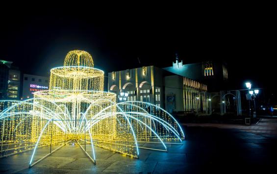 В Курске началось новогоднее оформление городских пространств. На улице Ленина уже установлены световые инсталляции «Ёлка» и «Коньки», на Театральной площади смонтирован большой светодиодный фонтан.