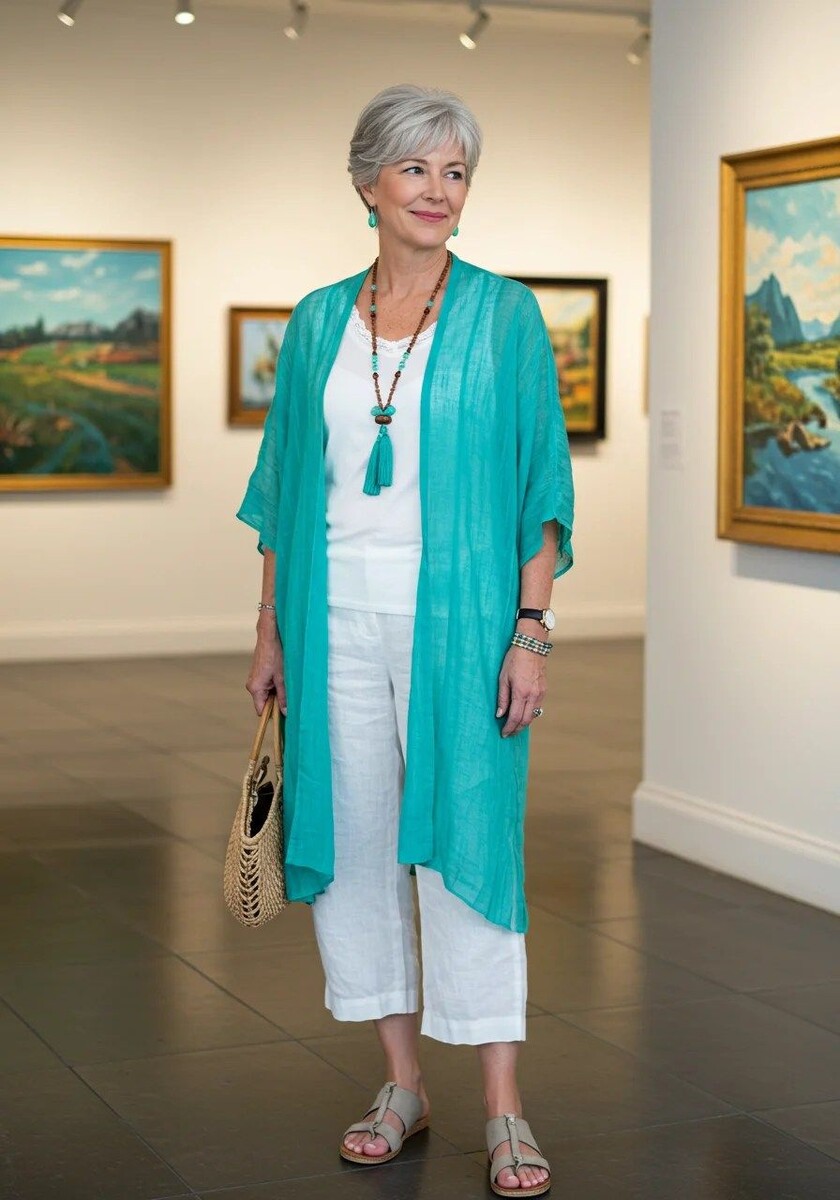 - Комплект в белом цвете: идеально подойдет укороченные широкие брюки и футболка из натуральных тканей. Этот образ прекрасно дополняется бирюзовым кардиганом длиной ниже колен и легкими сандалиями на низком ходу. Не забудьте о стильной плетеной сумке и ярких аксессуарах: подвеске и браслетах.