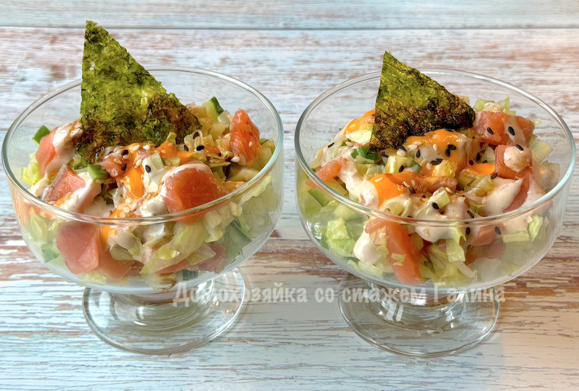 При подаче салата важно не забыть о соусах, которые играют ключевую роль в создании гармоничного вкуса. Вместо традиционного майонеза лучше использовать разнообразные соусы, чтобы подчеркнуть индивидуальность каждого ингредиента. Завершите блюдо посыпкой кунжутными семенами и хрустящими чипсами нори, которые добавят финальные акценты на мерцающем новогоднем столе.