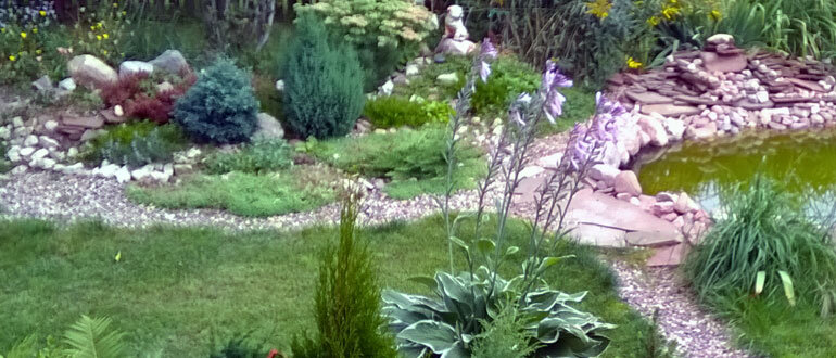 Хозяйственные постройки можно скрыть с помощью хвойных деревьев или живых изгородей. Огород стоит оградить невысокими заборчиками или плетеными изгородями, чтобы он не выглядел неуместно. Перед домом следует оставить пространство для газона и цветника, учитывая при этом вид из окон или террасы.
