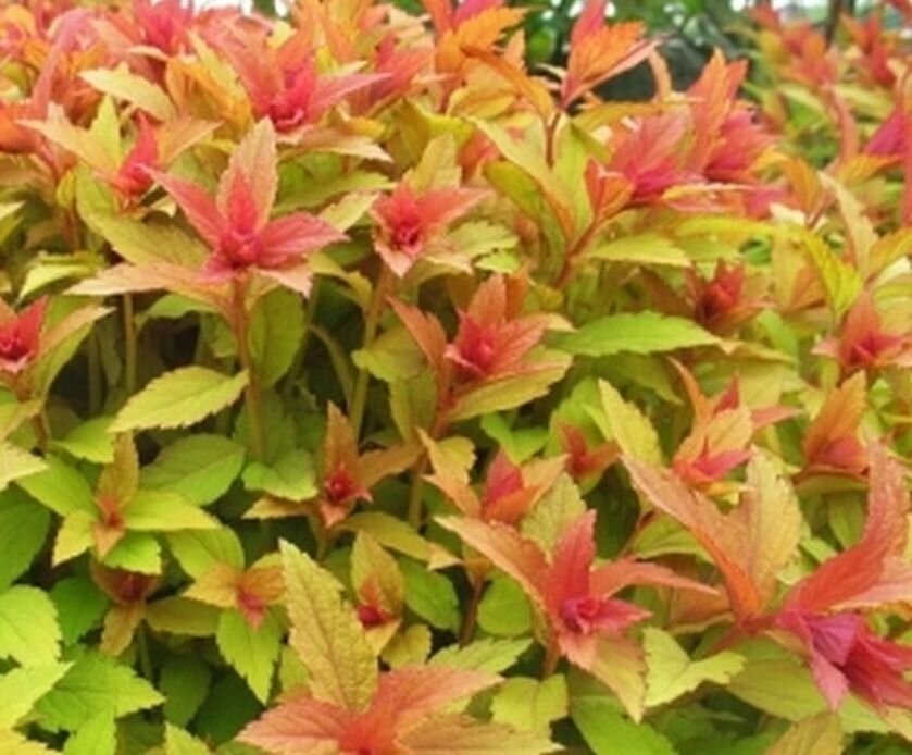 - Голдфлэйм: Образует густую крону высотой 70 см, которая меняет цвет в течение сезона, предоставляя новые неожиданные оттенки. Цветение длится с июля по август, когда растение украшается яркими цветами.