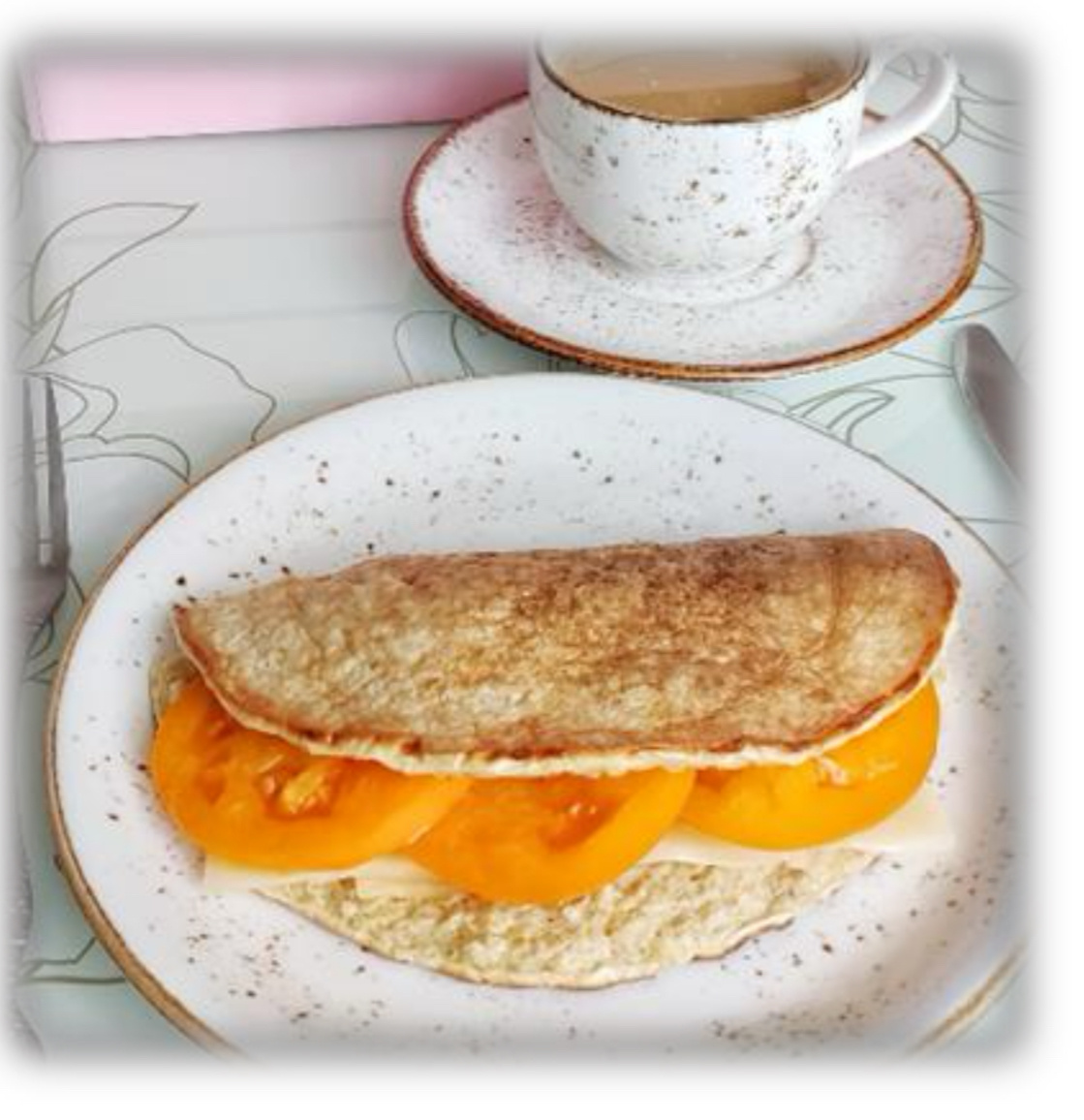 Смешать все ингредиенты, испечь на антипригарной сковороде, добавить сыр и помидоры, сложив блин пополам. Такой завтрак подарит ощущение сытости и удовлетворения.