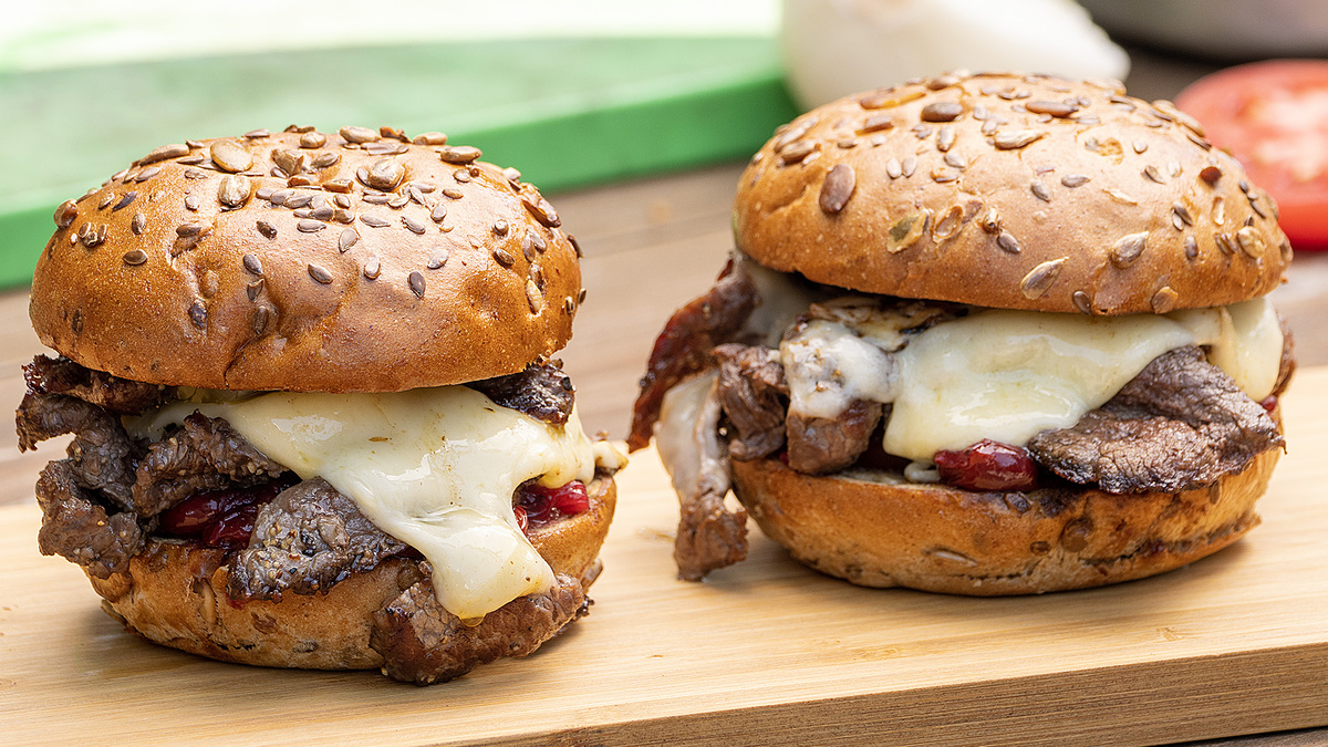 На одну половину булочки выложить вишневый соус, после чего положить стейки и плавленый сыр. Для любителей острых ощущений допустимо добавить маринованные халапеньо и сверху накрыть второй половинкой булочки. Это блюдо станет идеальным дополнением к летнему столу!