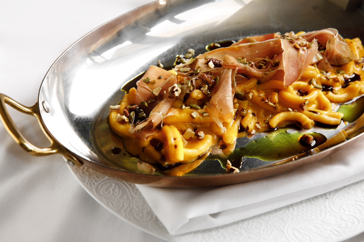 Процесс готовки начинается с подготовки тыквы: её очищают, нарезают, и запекают вместе с медом, морковью, чесноком и тимьяном в духовке при температуре 170-180 градусов до мягкости. После этого запеченные овощи помещают в блендер и превращают в однородный крем, добавляя немного ванили и куркумы. Параллельно отваривается паста до состояния аль денте, после чего её соединяют с тыквенным кремом и подогревают, добавляя тертые сыры и сливочное масло. Напоследок пасту украшают пармской ветчиной, жареными тыквенными семечками и поливают тыквенным маслом.