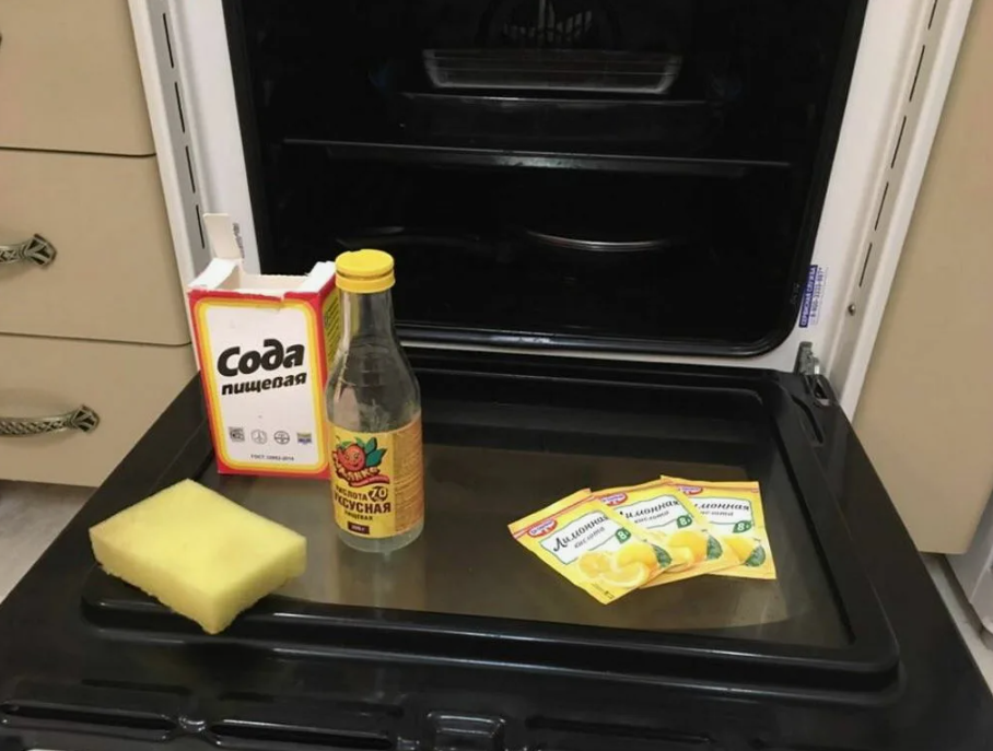 - Сода и уксус: Отлично подходит для сильного загрязнения. Смешайте три столовые ложки соды с водой до состояния пасты и равномерно нанесите на стенки духовки. Оставьте на 8-12 часов, после чего протрите влажной тряпкой и опрыскайте уксусом для лучшего результата.