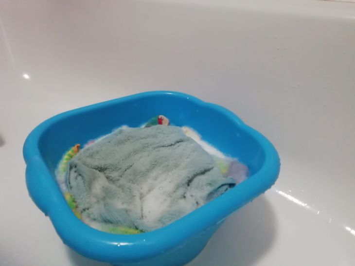 После возьмите чистое хлопчатобумажное полотенце и положите на него испачканную одежду пятном вниз. Сверху налейте средство для мытья посуды. Лучше подходит не мягкое натуральное, а то, которое содержит более агрессивные компоненты.