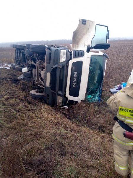 ДТП произошло приблизительно в 09:42 на 25-м километре трассы Курск-Фатеж. Водитель не справился с управлением на повороте, большегруз съехал в кювет, и машина перевернулась.