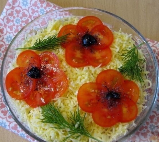 Для украшения, нарежьте помидоры черри тонкими кружочками и выложите в форме лепестков. В центр цветов положите половинки оливки, присыпьте маком и добавьте веточки укропа.