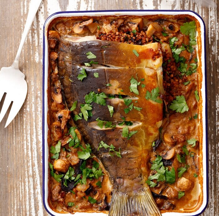 Запеченный карп с грибами и гречкой подается горячим и станет настоящим акцентом на новогоднем столе!