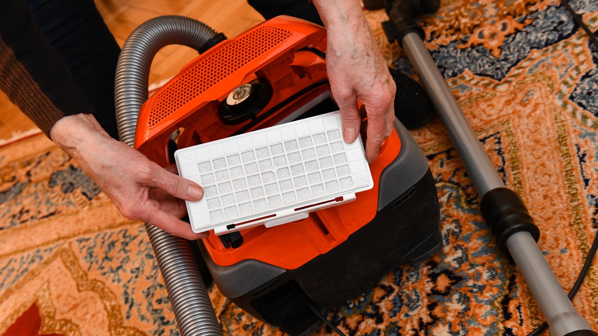 Спасти пылесос можно с помощью хитрого трюка. Вам понадобится старый носок, желательно не слишком плотной вязки. Вытащите фильтр и натяните на него носок, свободный конец заправьте внутрь.