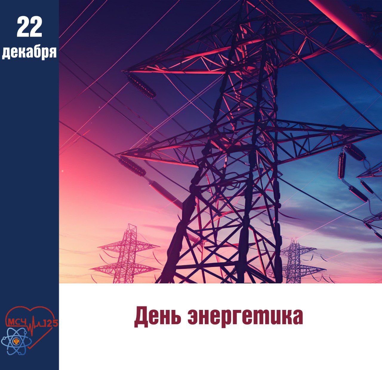 Коллектив ФГБУЗ МСЧ № 125 ФМБА России поздравляет энергетиков с профессиональным праздником. Желаем вам крепкого здоровья и бодрости духа, стабильности и надёжности — как в энергосистемах, так и в личной жизни, профессиональных достижений и новых перспективных проектов. Пусть ваш жизненный «энергобаланс» всегда остается положительным, а рядом будут надежные коллеги, любящие семьи и верные друзья. Спасибо за ваш неоценимый вклад в развитие страны и комфорт миллионов людей!