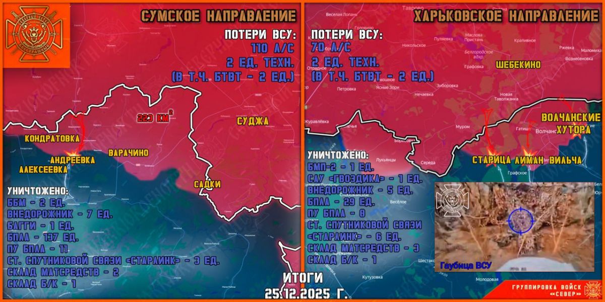 К утру 26 декабря группировка войск «Север» переломила сопротивление ВСУ и продвинулась в Андреевке и на восьми других участках Курско-Сумского фронта. На всем участке идут кровопролитные и ожесточенные боестолкновения.
