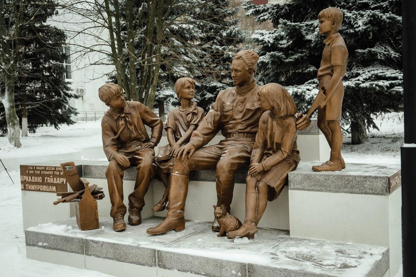 Открытие скульптурной композиции курскому писателю Аркадию Гайдару и тимуровцам в Курске в честь 85-летия со дня выхода на экраны фильма "Тимур и его команда"