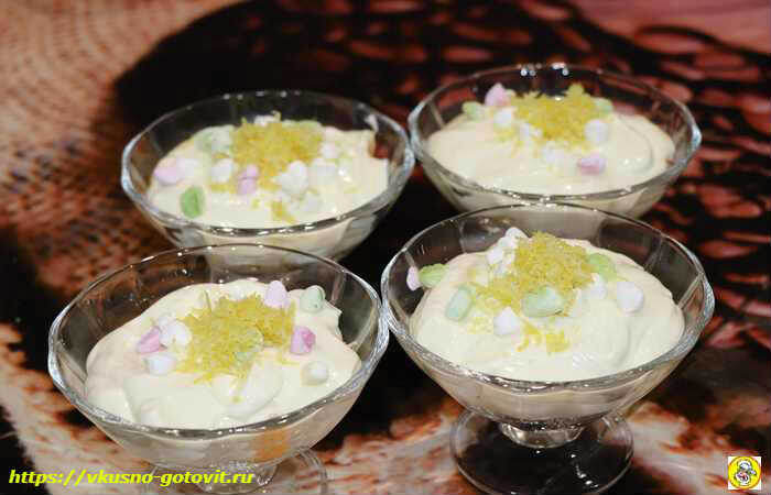 8. Украсить кусочками зефира и посыпать тертой лимонной цедрой. Отправьте десерт в холодильник на пару часов, чтобы он хорошо охладился.