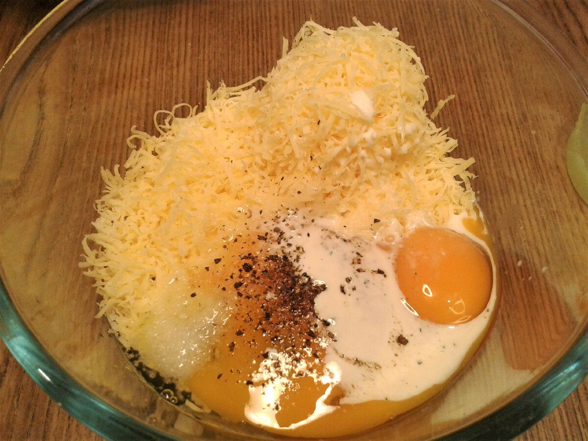 Теперь пришло время собрать все ингредиенты воедино. Мелко нарежьте шпинат и смешайте его с яйцами, сливками, натертым сыром, щепоткой соли и перца. Получившуюся массу тщательно перемешайте до однородности.