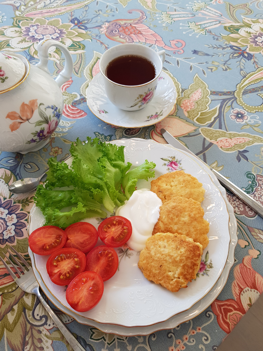 После того, как оладьи готовы, выложите их на тарелку, предварительно украсив прочими вкусностями. Обязательно добавьте свежие листья салата и нарезанные помидоры, а не забудьте о порции сметаны — это придаст окончательному блюду особый шарм.
