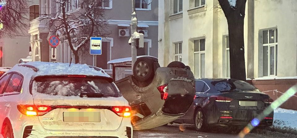 Вечером 30 декабря в центре Курска на улице Ленина произошло серьёзное ДТП. По предварительным данным очевидцев, автомобиль перевернулся и остался лежать на крыше рядом с музыкальным колледжем имени Свиридова.