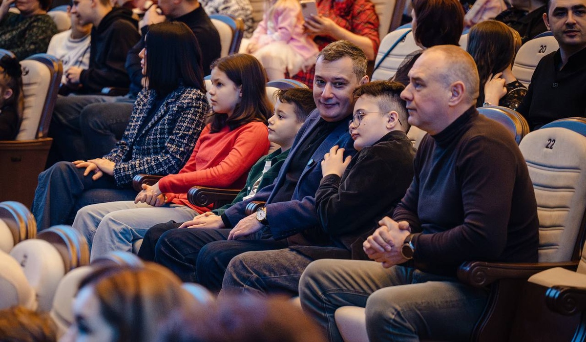 Губернатор Александр Хинштейн с сыновьями посетил новогодний спектакль «Емелино счастье» в Курском драмтеатре.