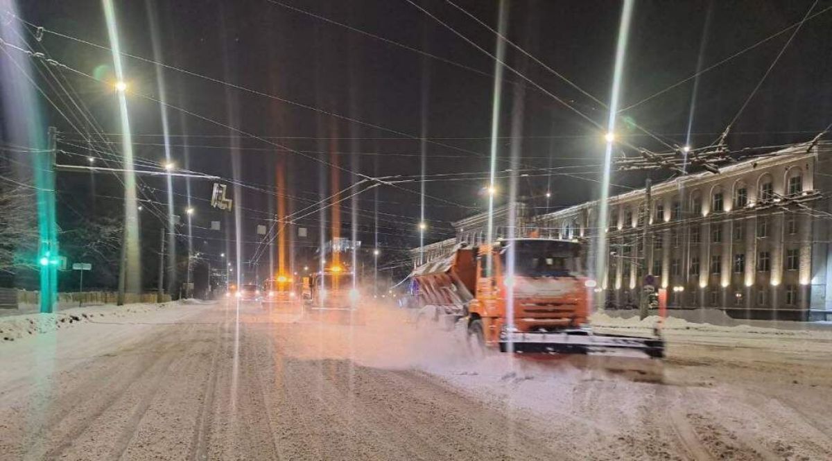 В ночь на улицы вывели 78 единиц спецтехники. Днём работы продолжатся: планируется очистка магистралей, подъездных карманов, пешеходных переходов, подходов к социальным объектам и лестничных спусков.