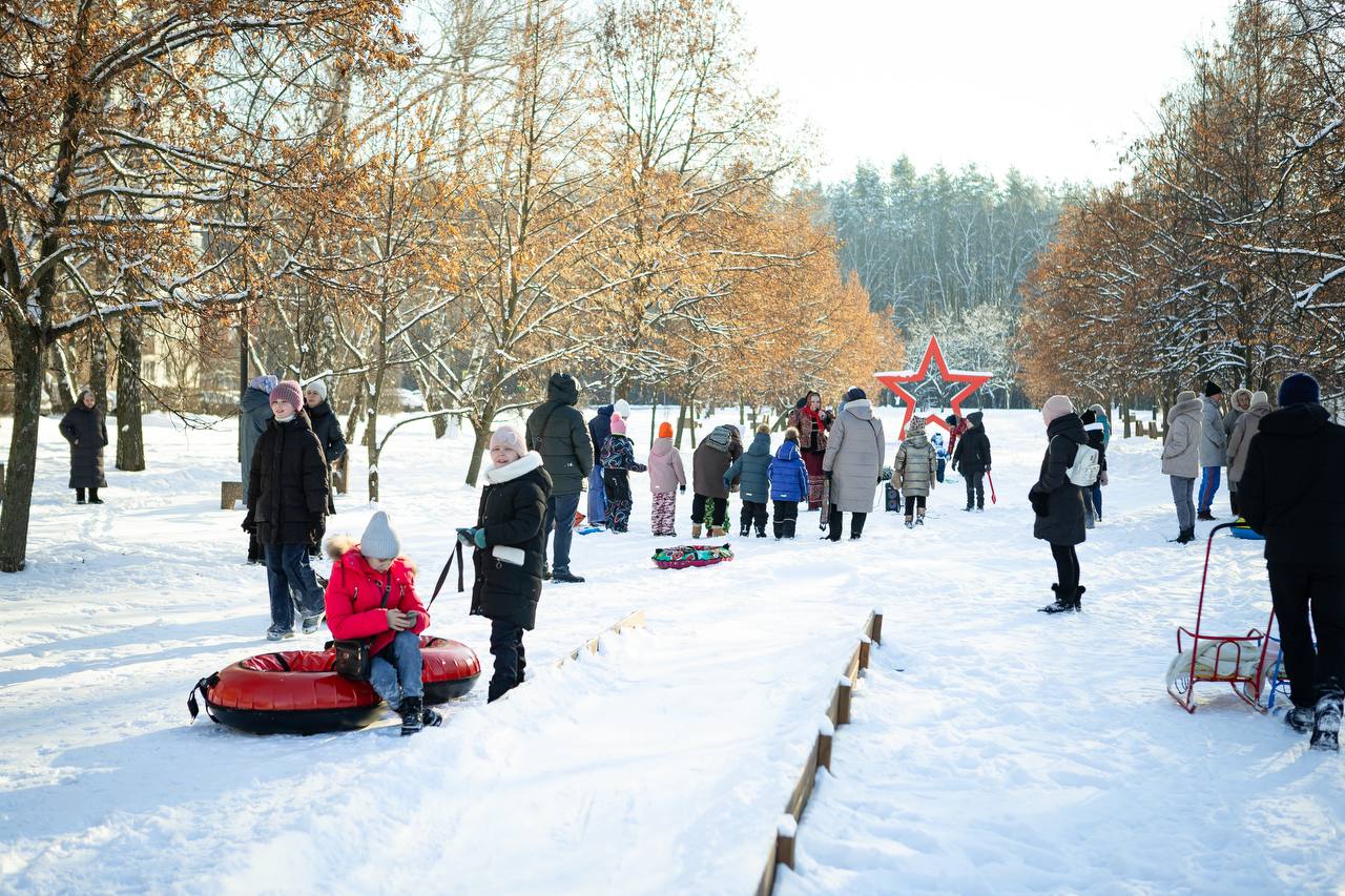 Возле городского культурного центра «Лира» рядом с новой тюбинговой горкой сотрудники учреждения организовали для детей и их родителей игровую программу.