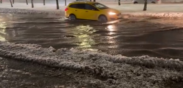 Резкая оттепель после вчерашнего снегопада с метелью превратила некоторые улицы Курска в реки.
