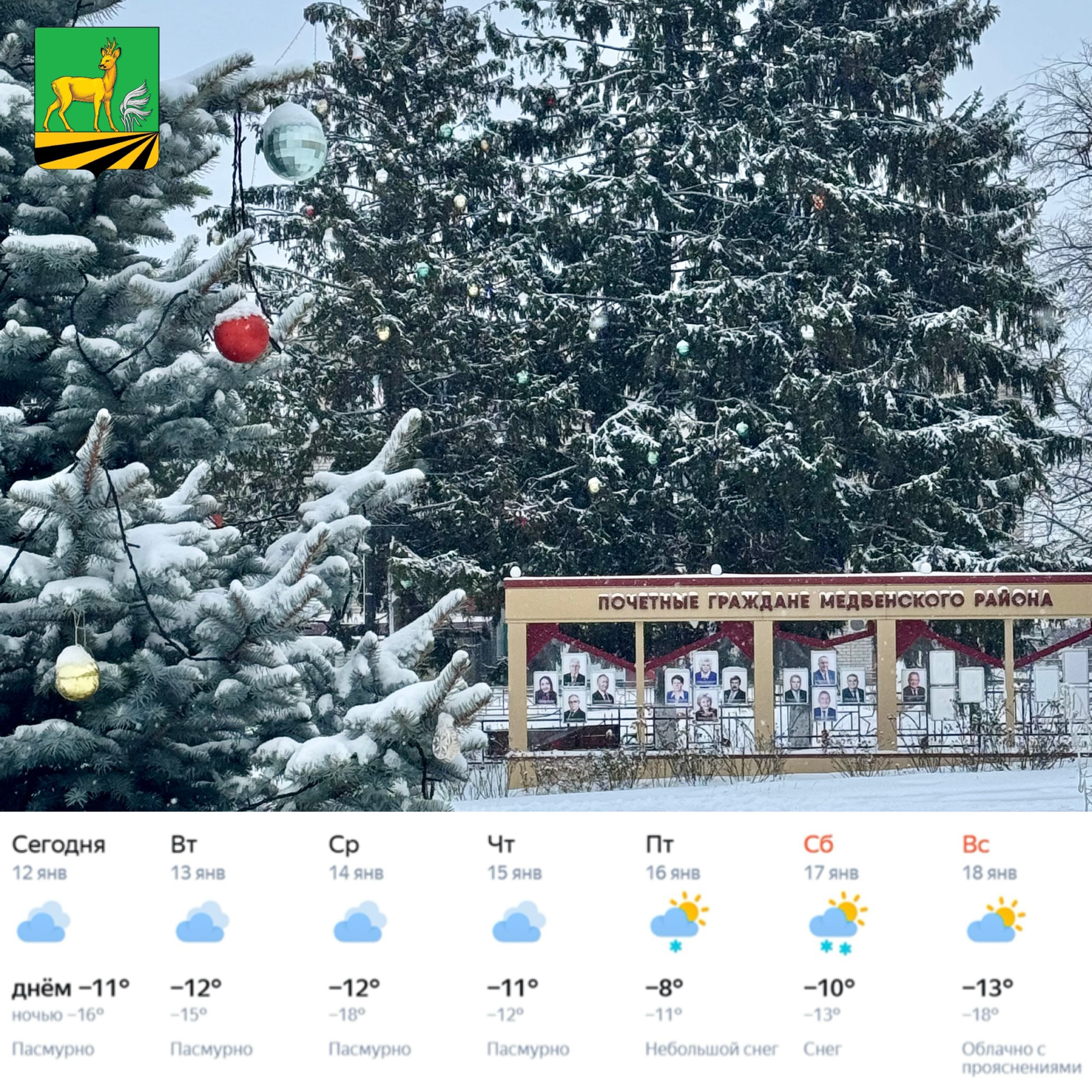 Сегодня 12 января, погода -12 градусa. Пасмурно, ветер легкий, западный 2.1 м/с. Атмосферное давление 742 мм рт. ст. Относительная влажность воздуха 81%.Завтра ночью температура воздуха понизится до -15 градусов, ветер изменится на южный 0.5...
