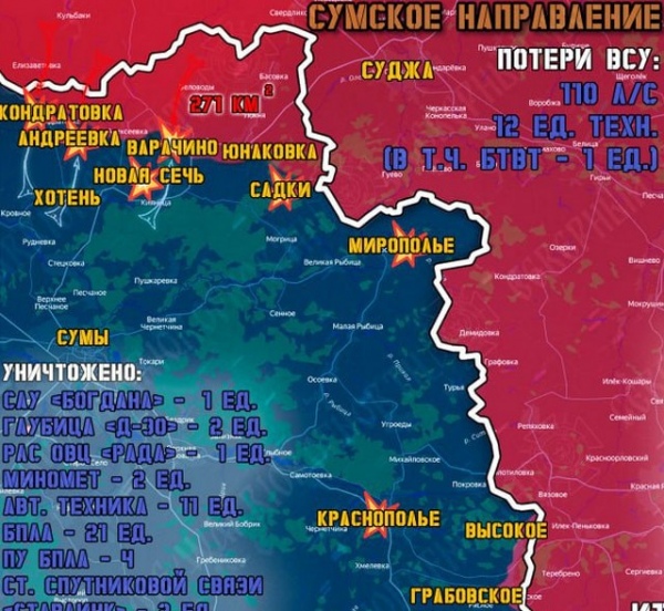 За сутки потери противника составили свыше 110 человек. В Сумской области российскими военными ликвидированы САУ «Богдана», две гаубицы Д-30 и два миномета, РЛС ОВЦ «Рада», десять внедорожников и багги, четыре пункта управления БПЛА, две станции спутниковой связи «Старлинк», три склада, 17 беспилотников самолетного типа и четыре БПЛА типа «Баба Яга».