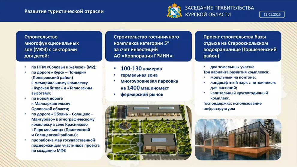 В Курской области огласили планы по развитию туризма. В частности, точками притяжения станут пятизвездочная гостиница в Курске и многофункциональные зоны с детскими площадками.