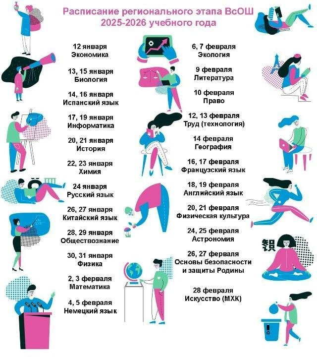 12 января пройдут состязания по экономике, 13 и 15 — по биологии, 14 и 16 — по испанскому языку. Подробное расписание представлено на фото.