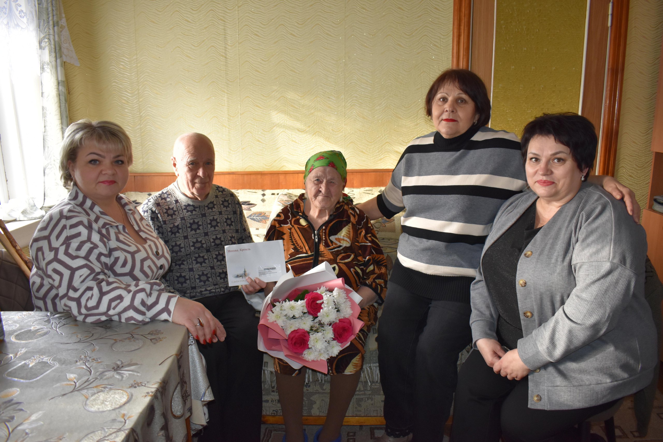 Заместитель Главы Администрации Железногорского района Уткина Татьяна Сергеевна с пожеланиями благополучия, мира и добра вручила Клавдии Андреевне поздравительный адрес от Президента Российской Федерации Владимира Владимировича Путина, и от Главы Железногорского района Александра Дмитриевича Фролкова, а также букет цветов. К поздравлениям присоединились Начальник Управления социальной защиты населения Локотилова Ольга Михайловна и специалист Администрации Михайловского сельсовета Пономарева Елена Станиславна.