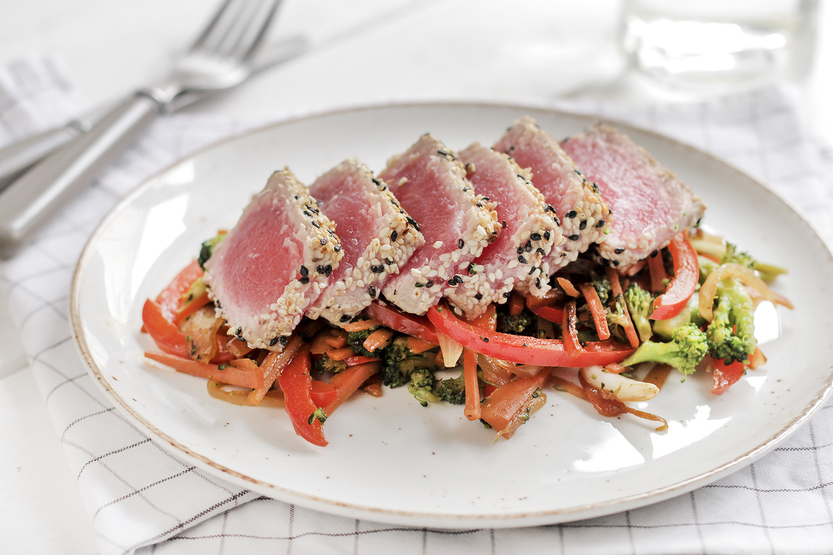 Шаг 4: Приправить тунца солью и перцем, обвалять в кунжуте. На другой сковороде с 1 столовой ложкой растительного масла обжарить тунца по 1-2 минуты с каждой стороны на среднем огне. После обжаривания дать рыбе отдохнуть под крышкой 5 минут, затем нарезать на кусочки и подать на подушке из овощей.