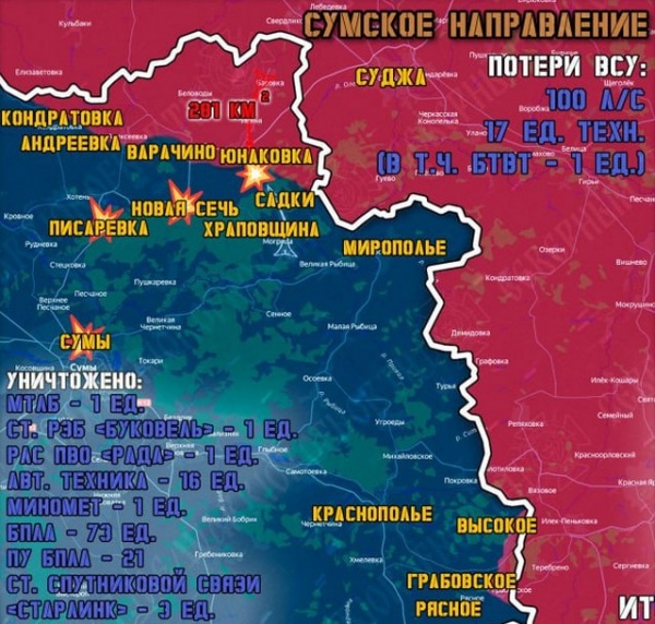 На Теткинском и Глушковском участках фронта существенных изменений не зафиксировано. Авиация ВКС РФ ликвидировала позиции противника возле сел Диброва (Фрунзенка) и Ястребиного в Сумской области.