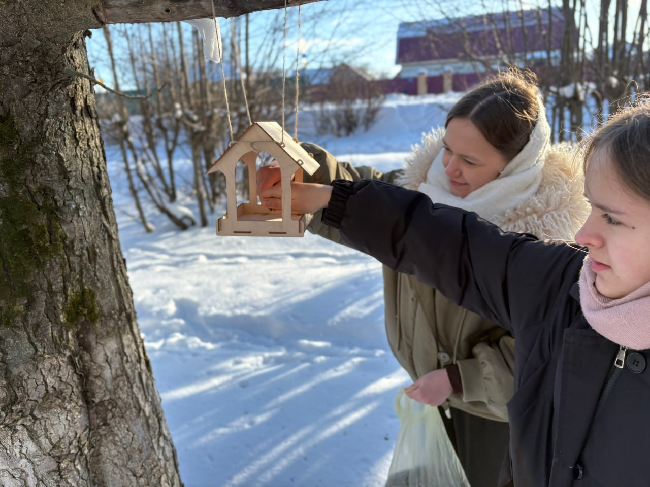 Разместили кормушки в тихих и безопасных для птиц местах — на деревьях возле школьного двора и у спортивной площадки.