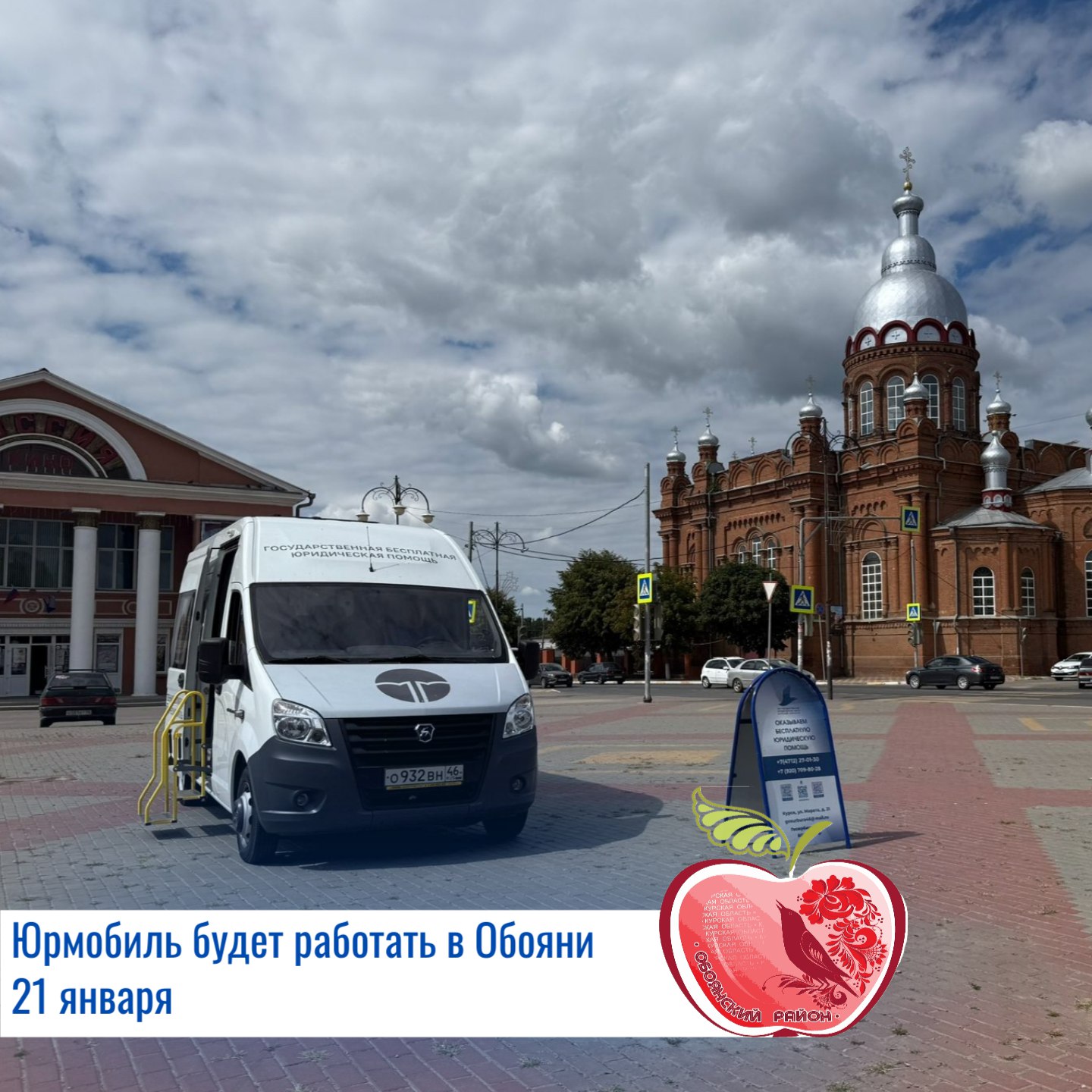 ОКУ «Госюрбюро Курской области» проводит выездной прием по оказанию бесплатной юридической помощи населению в Обоянском районе.Спецавтомобиль мобильного офиса «Юрмобиль» будет находится на площади им.Петрова 21 января.