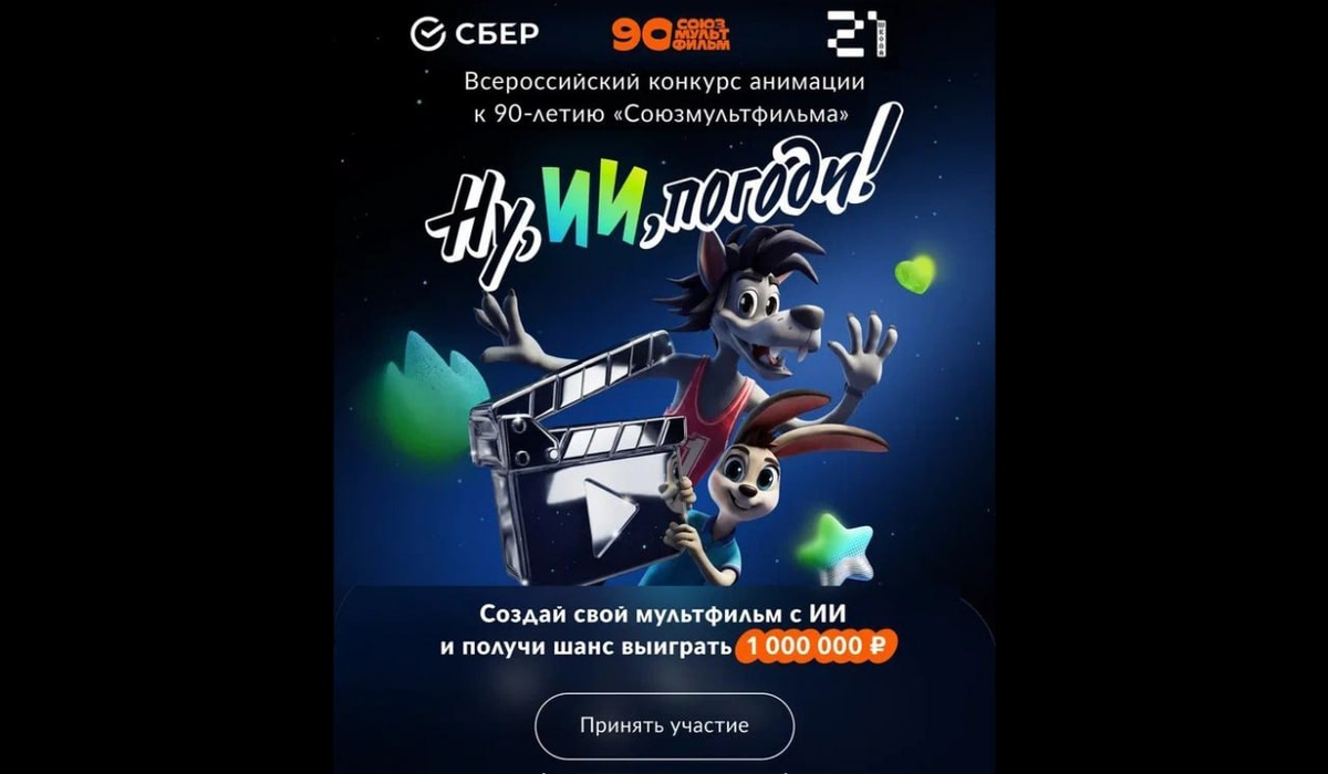 Сбер, «Союзмультфильм» и «Школа 21» объявили о запуске Всероссийского конкурса анимации «Ну, ИИ, погоди!», приуроченного к 90-летнему юбилею киностудии.