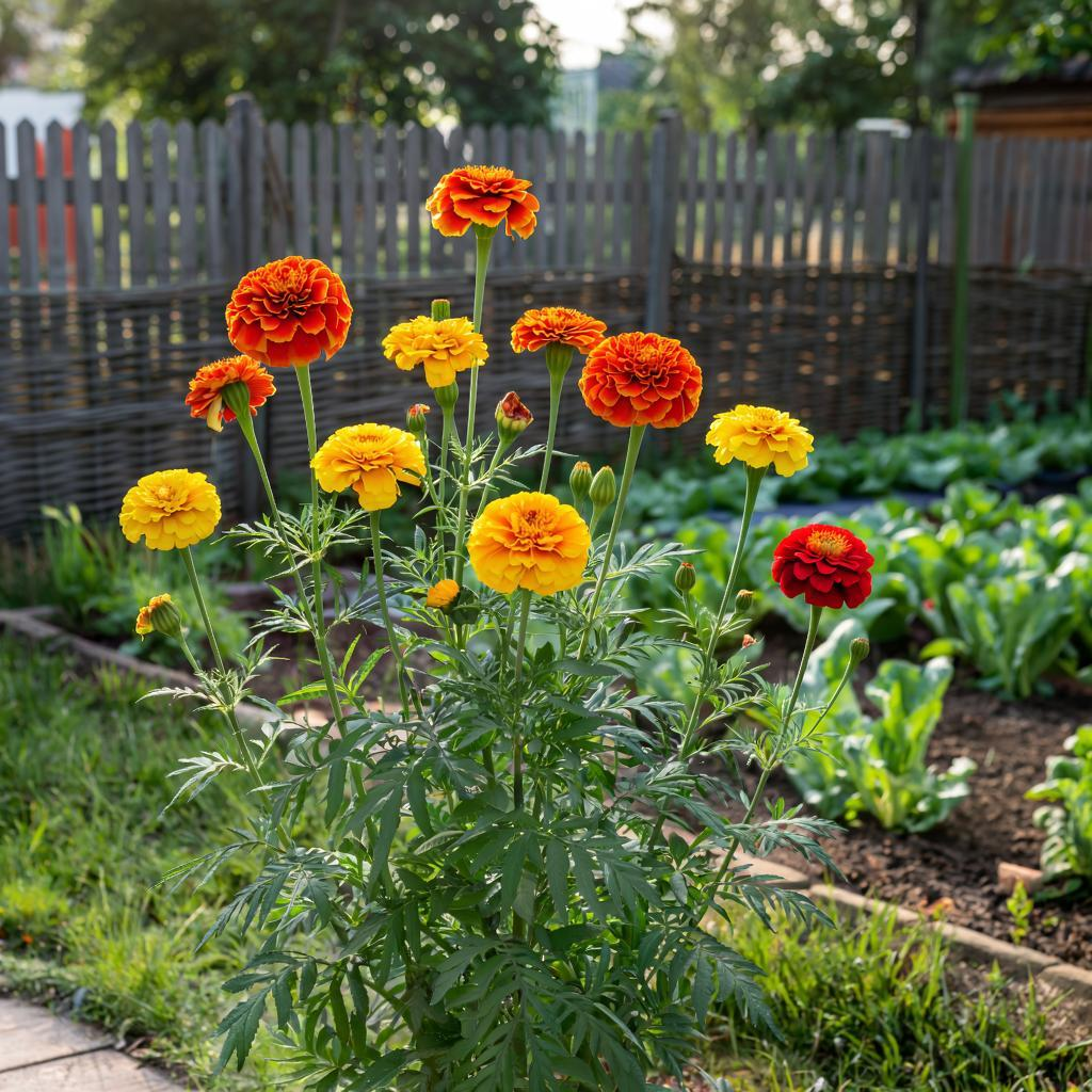 - Рядом с корнеплодами: Особенно это касается редиса и моркови. Активные выделения бархатцев могут угнетать прорастание семян и развитие корней, что приводит к искривленным и мелким урожаям.