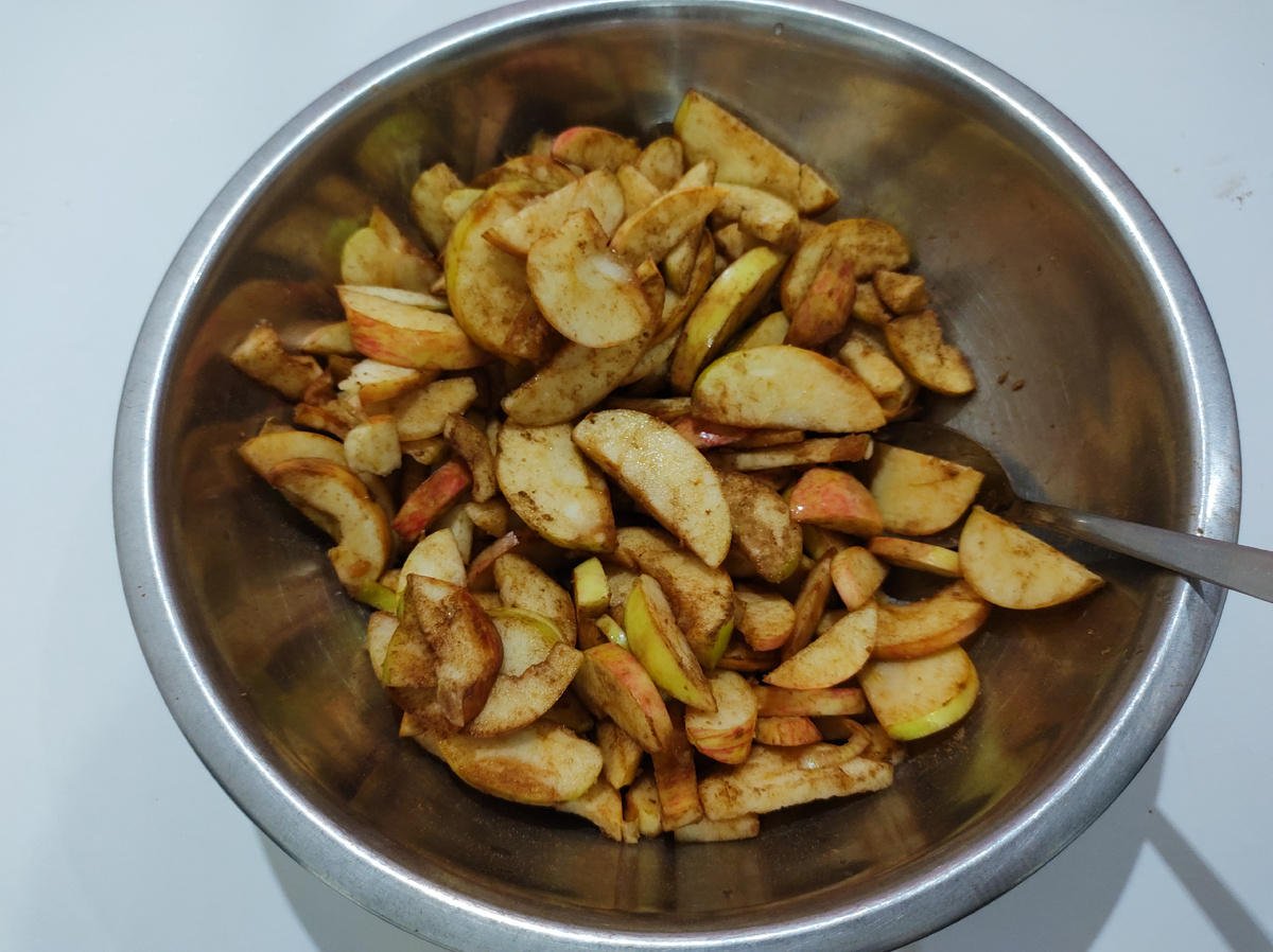 2. В яблоки добавляется чайная ложка корицы, после чего их следует тщательно перемешать.
