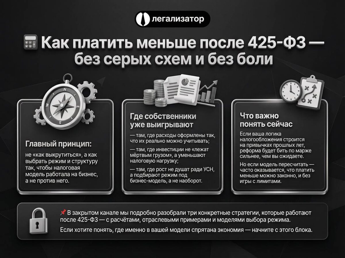 Кроме того, в закрытых каналах уже обсуждены три эффективные стратегии, действующие после внедрения 425-ФЗ, с примерами и расчетами. Понимание того, где ваша модель может сэкономить — отличный старт для оптимизации бизнес-процессов.