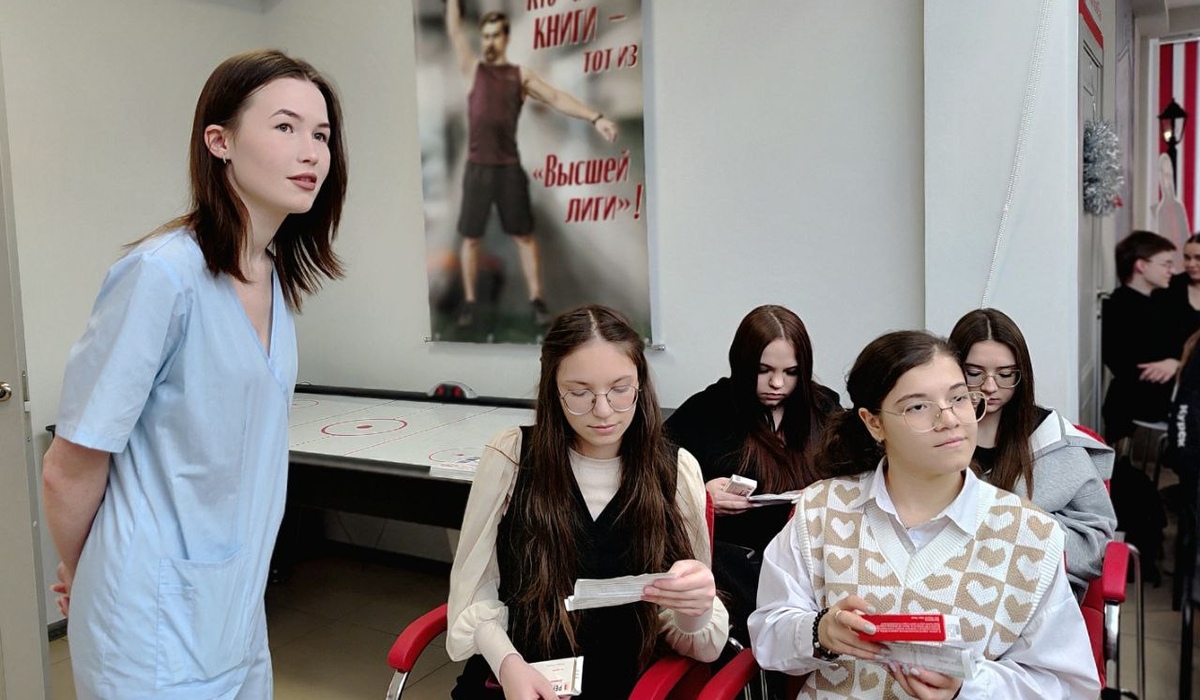 Обучающиеся Курского базового медицинского колледжа вместе с преподавателем провели тематическую лекцию и мастер-класс. Представители Курского государственного университета рассказали о направлениях подготовки и студенческой жизни.