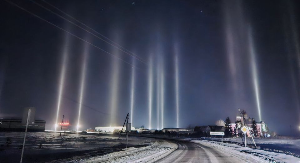 Вечером 23 января жители Курска и Мантуровского района стали свидетелями редкого атмосферного явления - световых столбов. Это зрелище возникает, когда свет от фонарей, уличных огней или других источников отражается от плоских граней ледяных кристаллов, парящих в воздухе при сильном морозе.