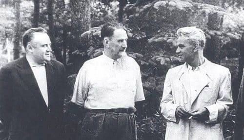 Первая фотография получила шутливое название "Три К". Три титана науки - Королев, Курчатов, Келдыш, которые стояли во главе создания ракетно-ядерного щита нашей страны. Снимок 1959 года сделали на даче у Курчатова.