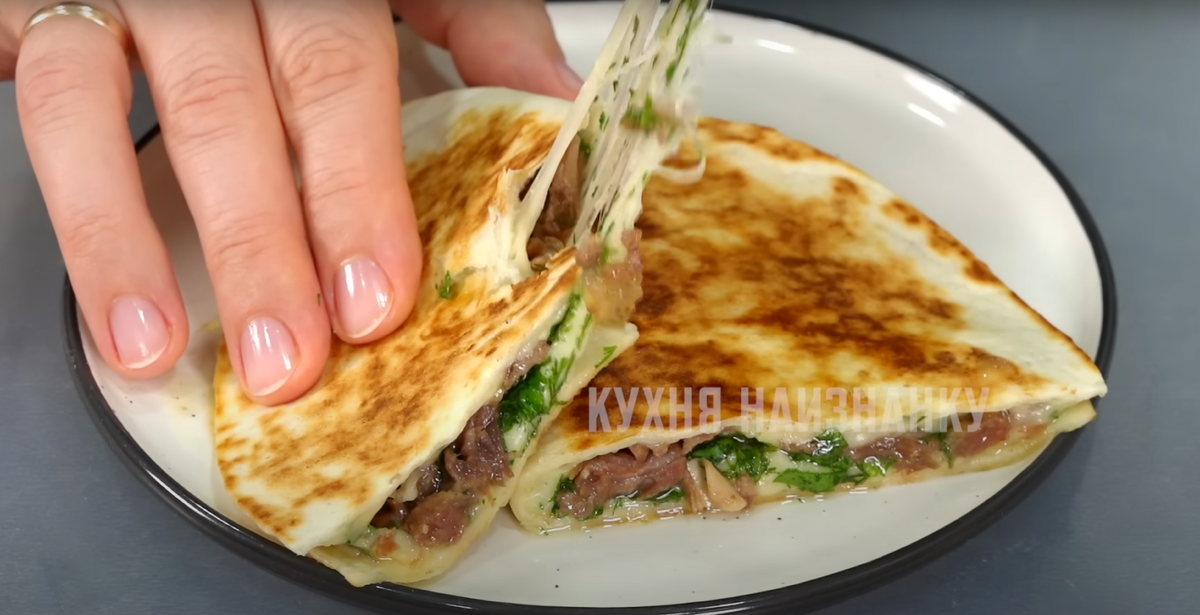 Сначала откройте банку с тушёнкой, используйте в качестве основы лепешки. На одну часть лепешки натрите сыр, добавьте тушёнку и зелень, снова покройте сыром, а затем сложите пополам и обжарьте с обеих сторон до золотистого цвета.