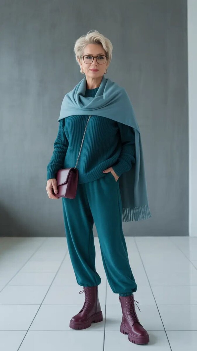 1. Эффектный кэжуал – зелёные спортивные штаны совмещают элементы удобства и актуальности с сине-зелёным джемпером, дополненным серо-голубым палантином. Завораживают темно-бордовые ботинки с «тракторной» подошвой и небольшая сумочка того же цвета.