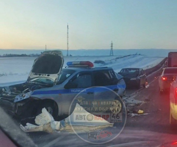 По предварительным данным очевидцев, выложивших фото с места в паблике «Автокадр_46», на федеральной трассе М2 «Крым» между Высоконскими и Соломыкинскими дворами дорогу не поделили три гражданские машины и служебный автомобиль полиции.