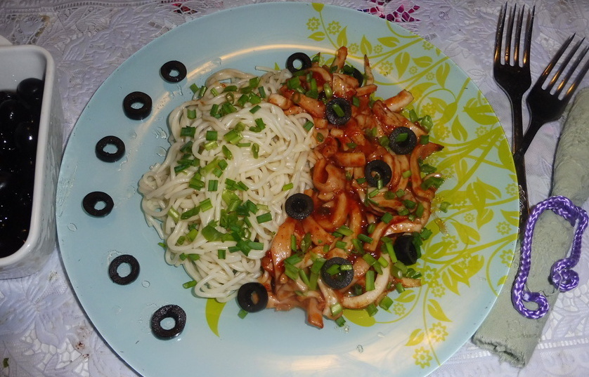 Первоначально спагетти отвариваются в большом количестве подсоленной воды. Как только они готовы, следует слить воду и заняться остальными ингредиентами. Затем кальмары отвариваются и нарезаются на кусочки. Лук обжаривается на растительном масле до золотистого цвета, после чего добавляются томаты и все специи.