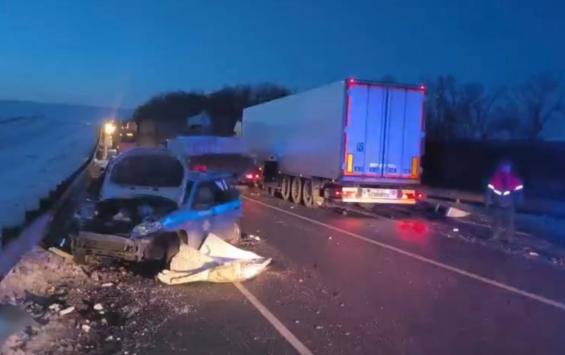 По предварительной информации, 57-летний водитель грузового автомобиля «Вольво», следовавший в сторону Курска, допустил столкновение с патрульным автомобилем Госавтоинспекции. Машина ДПС находилась на проезжей части с включёнными проблесковыми маячками — в этот момент инспекторы оформляли незначительное ДТП с участием автомобилей «Лада Гранта» и «Мазда».