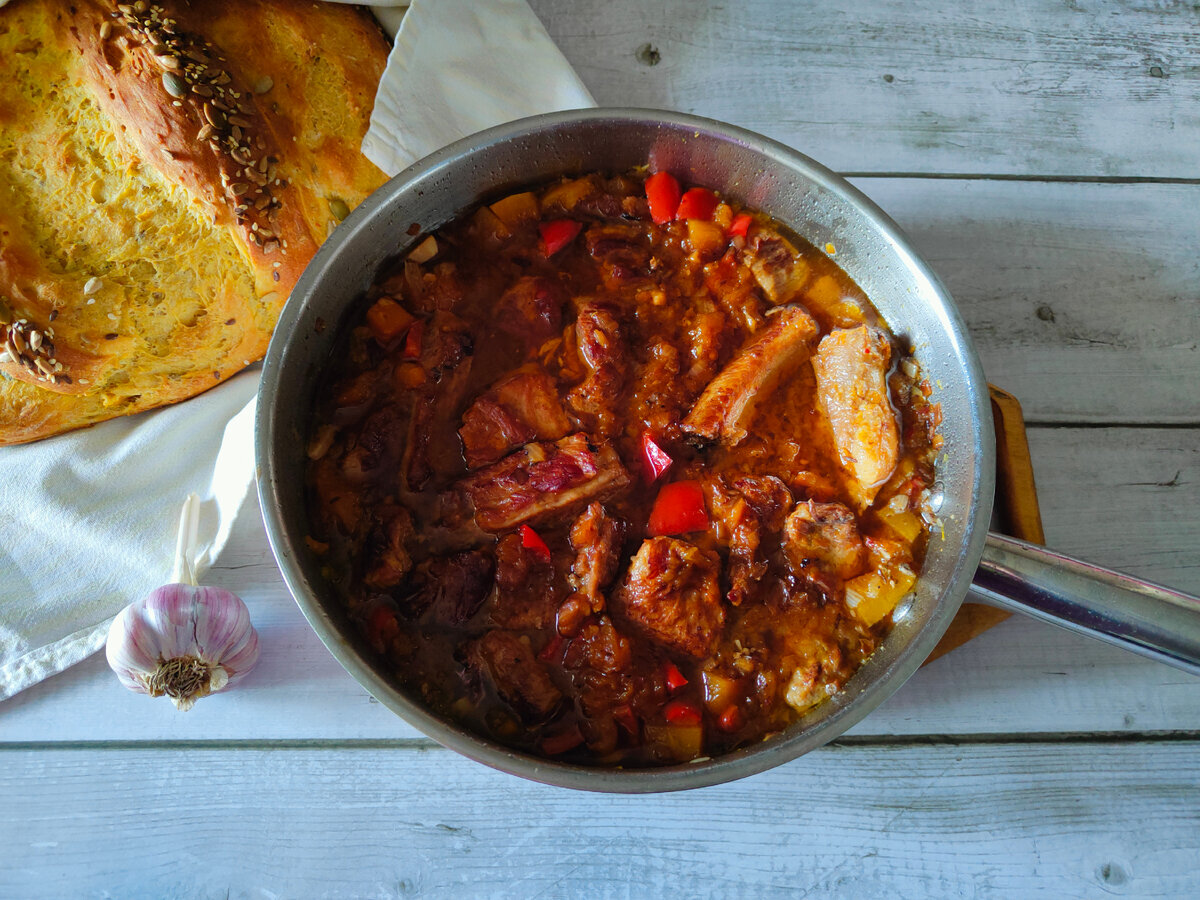 Кусочки свинины обжаривают до румяной корочки, после чего добавляют лук и чеснок. Следом идёт тыква и перец — каждый компонент разворачивает свой характер в подливке. В конце добавляют воду, чтобы половина содержимого была покрыта жидкостью, и тушат на слабом огне под крышкой примерно 40 минут. За это время мясо становится нежным, а соус — густым и ароматным.