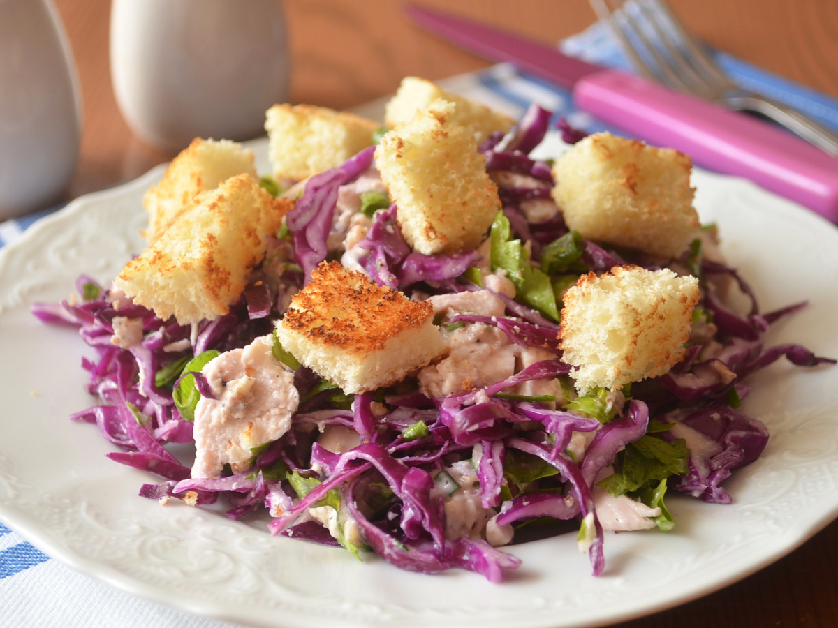 Краснокочанная капуста шинкуется и становится мягче под лёгким солью и лёгким размятием руками. Куриное филе нарезают кубиками, зелень рубят мелко. Хлеб подрумянивают до хрустящей корочки без масла, чтобы гренки сохраняли свою структуру при подаче.